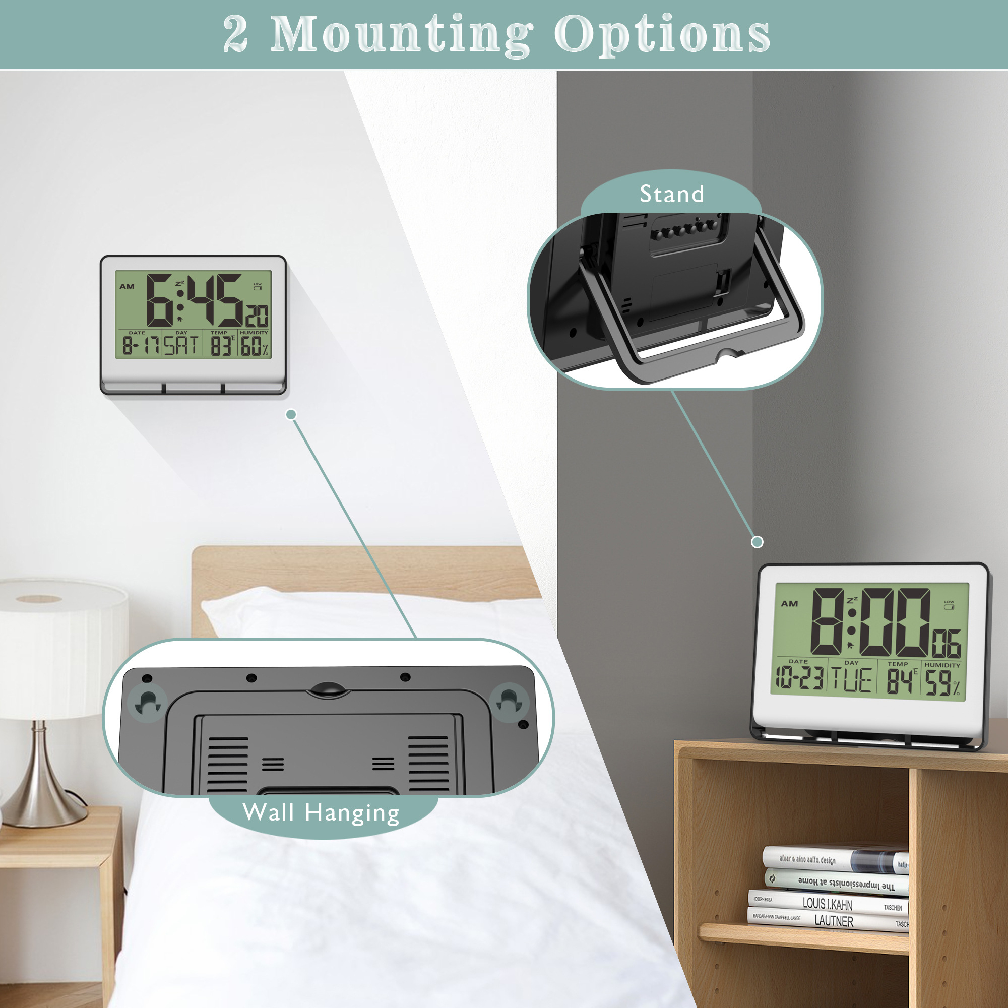 ·12/24 time, date, alarm, snooze, temperature, humidity, blue backlight.